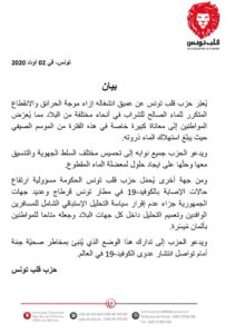 ودعا الحزب، في بيان له، إلى تدارك هذا الوضع الذي قال أنه “يُنبئ بمخاطر صحيّة جمّة أمام تواصل انتشار عدوى الوباء في العالم”.