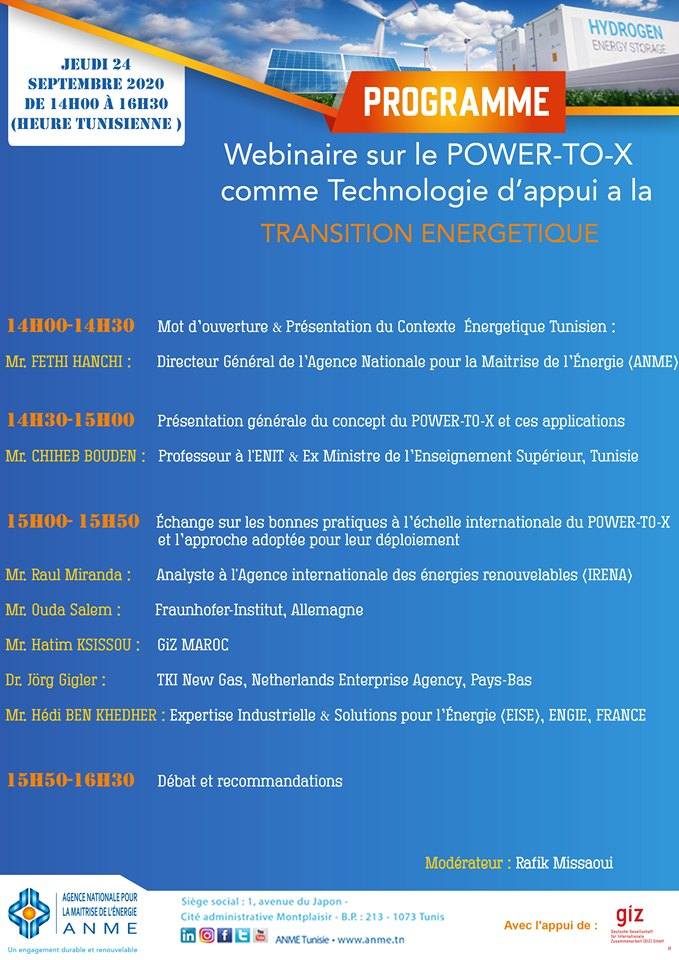 وقدّم المدير العام للوكالة الوطنية للتحكّم في الطاقة، فتحي حنشي، عرضا لسياق الطاقة التونسي، بالإضافة إلى عرض لمفهوم power-to-X وتطبيقاتها، من قبل وزير التعليم العالي الأسبق والأستاذ في المدرسة الوطنية للمهندسين، شهاب بودن.