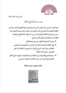 وقال بيان للمليكي، الذي يقدّم نفسه رئيسا للكتلة الوطنية بالبرلمان، والتي كانت انشقّت عن حزب “قلب تونس”، أنّ رضا شرف الدين، النائب في الكتلة، “تعمّد الدعوة بصفة غير قانونية إلى اجتماع للكتلة، رغم التنبيه عليه بواسطة عدل تنفيذ”، مشددا على أن اجتماع سوسة الذي عقده شرف الدين، “لاغ وغير قانوني”، وهدده بالإقالة، على حدّ تعبير البيان..