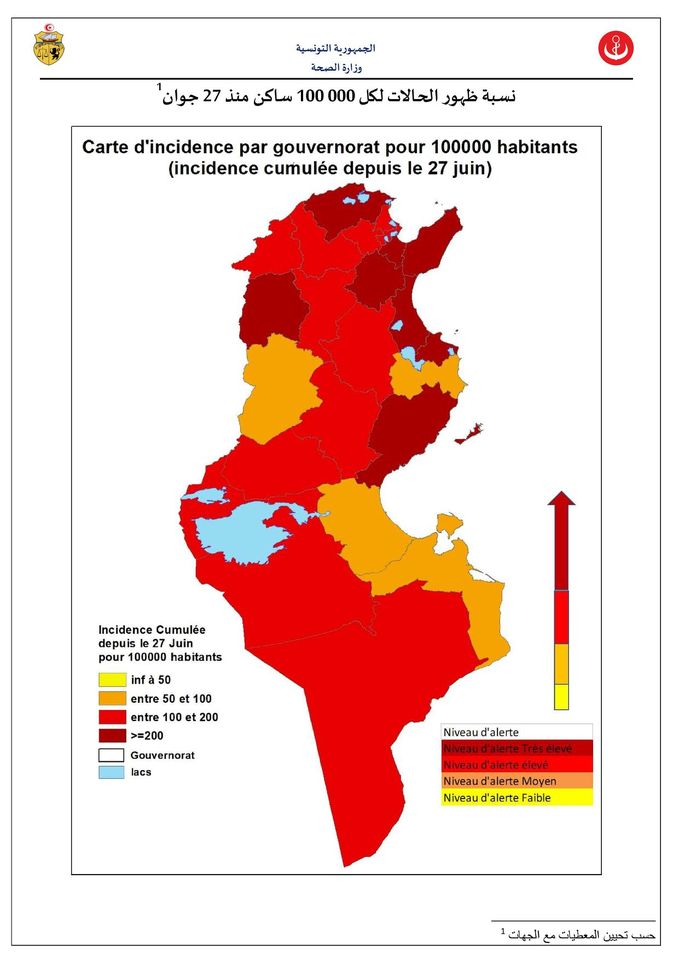 أعلنت وزارة الصحّة، أن عدد المعتمديات ذات الإنتشار “المرتفع جدّا” لفيروس “كورونا”، بلغت 70 معتمدية، في مختلف أنحاء الجمهورية، فيما بلغ عدد المعتمديات ذات “الإنتشار المرتفع” 50 معتمدية.