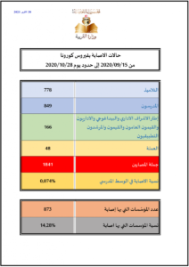 وأكدت هذه الإحصائيات التي تلقت “الرأي الجديد” نسخة من بياناتها، أنّ إجمالي عدد إصابات “كورونا” بالوسط المدرسي، بلغ 1841، (778 تلميذاً و849 مربياً و166 عون تأطير، إلى جانب 48 إصابة في صفوف العملة).