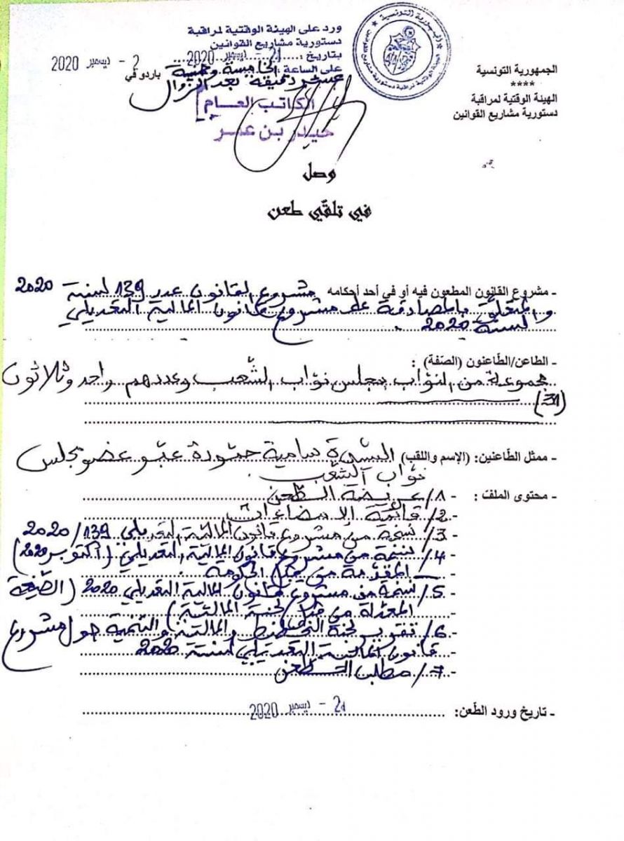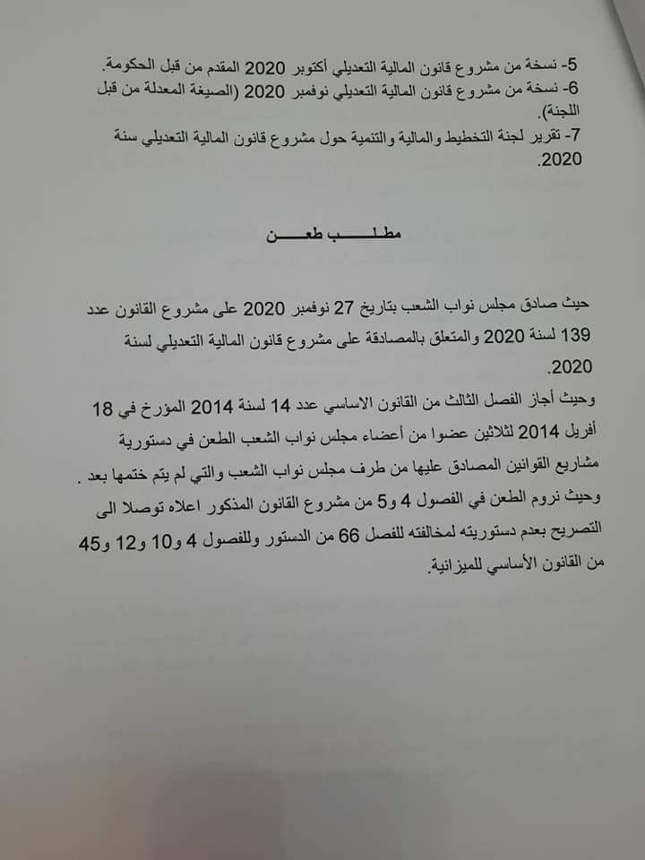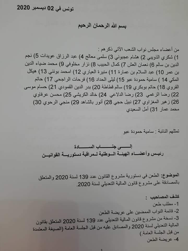 تقدّم 31 نائبا بطعن في دستورية الفصلين الرابع والخامس، من قانون المالية التعديلي لسنة 2020، أمام الهيئة الوقتة لدستورية القوانين.