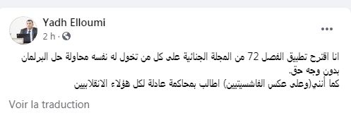 طالب القيادي في حزب “قلب تونس”، عياض اللومي، بتطبيق حكم الإعدام، على كل من يطالب بـ “حلّ البرلمان”، وفقا لمقتضيات الفصل 72 من المجلّة الجنائية.