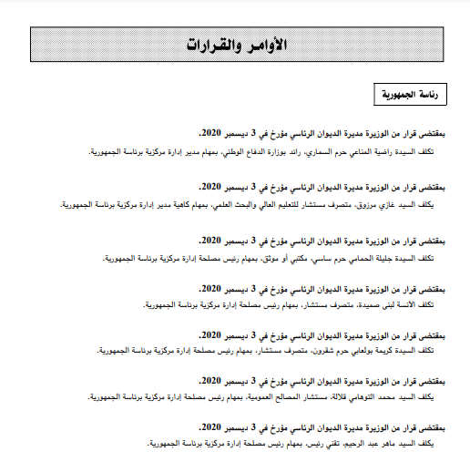 بقرار من مديرة الديوان الرئاسي، نادية عكاشة، صدرت بالرائد الرسمي عدد 124 بتاريخ 15 ديسمبر 2020، مجموعة من القرارات، الخاصّة برئاسة الجمهورية.