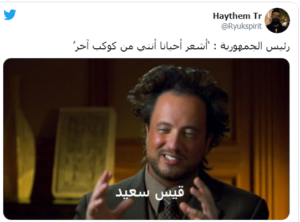 وتابع عبد السلام في منشور بموقع “فيسبوك”: “إما أن نرتحل نحن جميعا باتجاه كوكب السيد الرئيس، أو يعود هو إلينا في كوكبنا الأرضي، حتى نتكلم لغة مشتركة، ويفهم بعضنا بعضا (..)، سيدي الرئيس نحن نريد رئيسا يشبهنا ونشبهه ومن كوكبنا الأرضي المكوَّر ويمشي على أديم هذا التراب”، بحسب تعبيره.