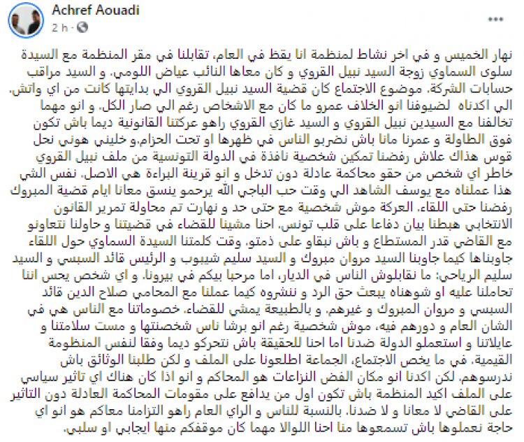 كشف رئيس منظمة “أنا يقظ”، أشرف العوادي، عن تفاصيل لقاء المنظمة بفريق رئيس حزب “قلب تونس”، نبيل القروي، يوم الخميس المنقضي.