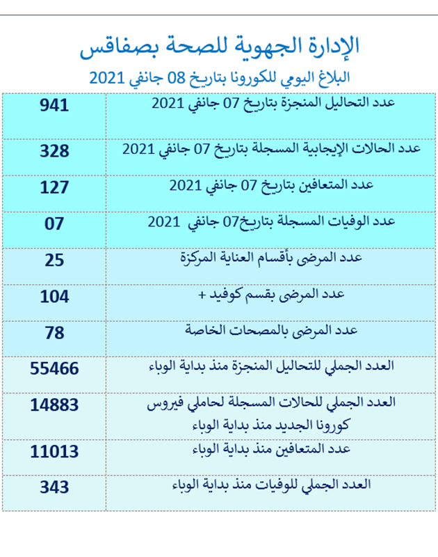 أعلنت الإدارة الجهوية للصحّة بصفاقس، أنه تمّ بتاريخ 7 جانفي 2021، تسجيل 7 وفيات و328 إصابة جديدة بفيروس “كورونا”.