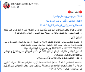 “في هذا الوضع الدقيق، وحتى لا يستكمل الملف، قام الوزير بإعفاء الدكتورة أمال بن سعيد، التي أعدت الإستراتيجية الوطنية للتلقيح covid 19 والخطة التنفيذية، وهي point focal تونس vis à vis كوفاكس والبنك الدولي، والتي تعرضت لضغوطات كبيرة من طرف محيطه الضيق !!!”..