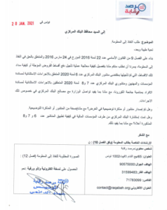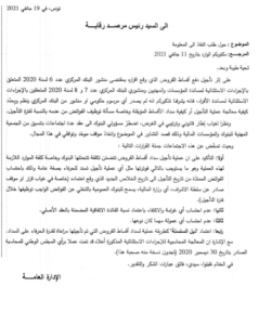 كـما تـوجـه الـمرصـد بـمراسـلة إلى السـيد رئـيس مجـلس نـواب الـشعب والـى السـيد رئـيس لـجنة الـمالـية بـالمجـلس، لـلمطالـبة بتعهـد الـلجنة بهـذا الـموضـوع، مـن أجـل الـتقصي فـي هـذه الـتجاوزات، ومـساءلـة الأطـراف الـمعنية، فـي إطـار دور المجـلس الـرقـابـي، لـلوقـوف عـلى أسـباب عـدم تـقيدها بالتراتيب الـــّصادرة فـــي هـــذا الـــشأن، ولتحـــديـــد الـــمسؤولـــيات ومـــطالـــبة الأطـــراف الـــمعنية، وفـــق صـــلاحـــياتـــها ومـسؤولـياتـها، بـردع الـمخالـفين واتـخاذ مـا يـلزم مـن تـدابـير لـتصحيح الإجراءات، ولإلـغاء كـّل الأعـباء الـتي تـّم تحـميلها عـلى الـمواطـنين والـمهنيين والـمؤسـسات، بـناء عـلى عـملية تـأجـيل سـداد الـقروض، ولـضمان وفـاء الـحكومـة بـكل تعّهـداتـها فـي إطـار مـسانـدة عـموم الـتونسـيين، عـلى تـجاوز تـداعـيات الإجـراءات الاحـتياطـية للتصدي لوباء “كورونا”.