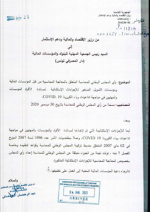ومـن بـين تـلك الخـطوات، مـراسـلة رئـيس الـحكومـة، لـحثه عـلى الالـتزام بـوعـود الـحكومـة حـيال الـتونسـيين، ومـطالـبته بـإعـطاء الإذن لإنـجاز مـهمة رقـابـية فـي مـوضـوع تحـميل الـتونسـيين أعـباء مـالـية تـناقـض مـا ورد فـي مـرسـوم رئـيس الـحكومـة عـدد 19 لـسنة 2020، ومـناشـير الـبنك الـمركـزي 6 و7 و8 لـسنة 2020 مـن تـأكـيد عـلى عـدم تحـميل الأفـراد والـمهنيين والـمؤسـسات، تـبعات مـالـية جـراء تـأجـيل أقـساط الـقروض.