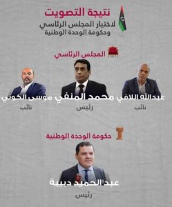 اختار أعضاء ملتقى الحوار السياسي الليبي في جنيف الجمعة القائمة الثالثة حصلت القائمة الثالثة الفائزة في تصويت أعضاء ملتقى الحوار السياسي، على 39 صوتا من أصل 73، وهي القائمة التي يرأسها محمد يونس المنفي، الذي انتخب لرئاسة المجلس الرئاسي الجديد، وعبد الحميد دبيبة رئيسا لحكومة الوحدة الوطنية.