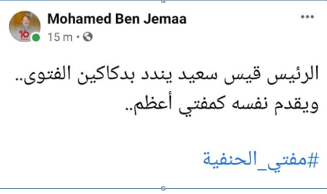 وفي هذا السياق، هاجم محمد بن جماعة، موقف سعيّد، عندما تحدث عن بعض “دكاكين الفتاوي”، قائلا في تدوينة له:” الرئيس قيس سعيد يندد بدكاكين الفتوى ويقدّم نفسه كمفتي أعظم #مفتي_الحنفية”، في إشارة منه إلى أن قيس سعيد يحرم على غيره ما يحلّله لنفسه.