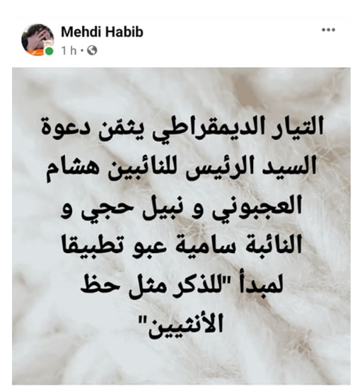 أمّا المدون “مهدي الحبيب”، قال في تدوينة له : ” التيار الديمقراطي يثمن دعوة السيد الرئيس للنائبين هشام العجبوني ونبيل حججي والنائبة سامية عبو تطبيقا لمبدأ للذكر حظ الأنثيين”