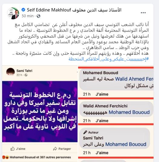 وهاجم سيف الدين مخلوف، في تدوينة له على صفحته بموقع التواصل الاجتماعي “فيسبوك”، الأمين العام المساعد في اتحاد الشغل، سامي الطاهري، بسبب تدويناته التي نشرها على ألفة الحامدي، والتي تضمّنت اتّهامات لها بالجملة.