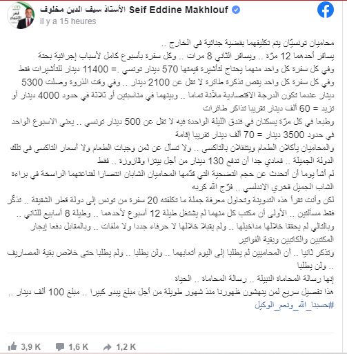وأضاف سيف الدين مخلوف، في تدوينة على حسابه بموقع التواصل الاجتماعي “فيسبوك”، أن المحاميين لن يطلبا أي مبلغ مقابل أتعابهما، ولا حتى خلاص بقية المصاريف، لافتا إلى أنهما سافرا إلى قطر 20 مرة من أجل القضية، وأن كل سفرة تتطلّب أسبوعا كاملا، نظرا ”للأسباب الإجرائية”.