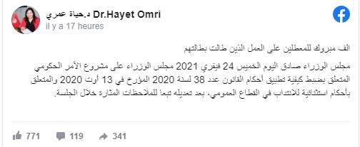 صادق مجلس الوزراء المنعقد أمس، على مشروع أمر حكومي، يتعلّق بضبط كيفية تطبيق أحكام القانون عدد 38 لسنة 2020، المؤرخ في 13 أوت 2020، والمتعلّق بأحكام استثنائية للانتداب في القطاع العمومي، بعد تعديله تبعا للملاحظات المثارة خلال الجلسة.