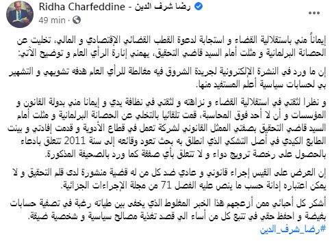 أعلن النائب، رضا شرف الدين، أنّه قام بصفة تلقائية، بالتخلّي عن الحصانة البرلمانية.