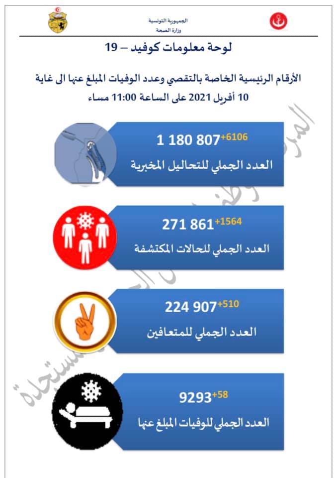وبلغت عدد حالات الوفيات نحو 58 حالة وفاة، إلى غاية 10 أفريل 2021، بما يجعل عدد الوفيات، يصل إلى 9293 وفاة حاليا.
