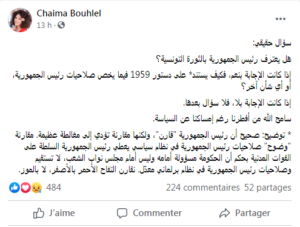 وتساءلت شيماء بوهلال من ناحية أخرى، قائلة: “هل يعترف رئيس الجمهورية بالثورة التونسية ؟؟”، مشيرة إلى أنّ مقارنته بدستور 1959 “مغالطة عظيمة”، حسب تقديرها..