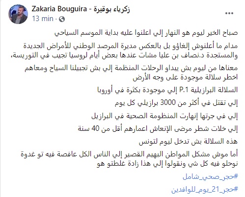 وقال زكرياء بوقيرة، في تدوينة نشرها على صفحته بموقع التواصل الإجتماعي “فيسبوك”، إنه لم يتمّ إلى حدّ الآن الإعلان عن التراجع عن هذا القرار بشكل رسمي، وهو ما “سيفتح الأبواب أمام دخول أخطر سلالة من فيروس كورونا وهي السلالة البرازيلية والتي انتشرت بكثرة في أوروبا”.
