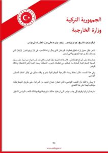 وعبر البيان، عن أمل تركيا، في أن تستعيد تونس “الشرعية الديمقراطية بأسرع وقت ممكن في إطار أحكام الدستور التونسي”.