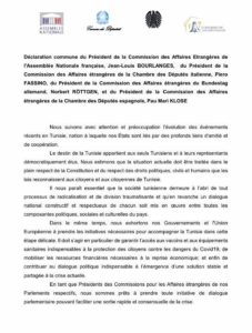 ووقع على هذا البيان، رؤساء لجان الشؤون الخارجية في الجمعية الوطنية الفرنسية “جون لوي بورلانج”، ومجلس النواب الإيطالي “بييرو فاسينو” والبرلمان الألماني “نوربرت روتجن”، وبمجلس النواب الإسباني “ماري كلوزة”.
