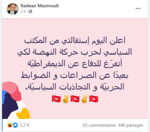 أعلن القيادي في حركة النهضة، رضوان المصمودي، اليوم، عن استقالته من المكتب السياسي للحركة.