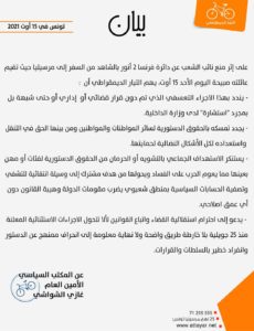 وطالب التيار الديمقراطي، بــ “احترام استقلالية القضاء، واتباع القوانين الموجودة، حتى لا تتحول الإجراءات الاستثنائية المعلنة منذ 25 جويلية، بلا خارطة طريق واضحة، ولا نهاية معلومة إلى انحراف ممنهج عن الدستور وانفراد خطير بالسلطات والقرارات”.