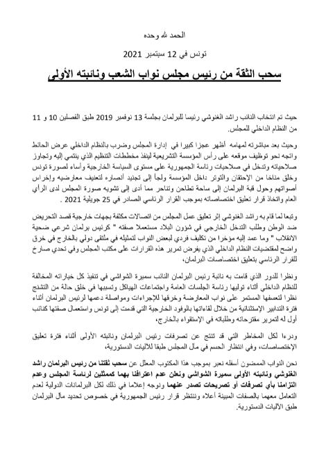 شرعت مجموعة من الكتل البرلمانية المجمّدة، في ترويج عريضة سحب ثقة من رئيس البرلمان المجمّد، راشد الغنوشي، والنائب الأولى سميرة الشواشي.