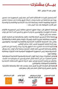 وطالبت هذه الأحزاب الموقعة على البيان، رئيس الجمهورية، “بالالتزام بتعهداته للتونسيات والتونسيين، باحترام الدستور، وباليمين التي أداها قبل تولي مهامه على رأس الدولة.