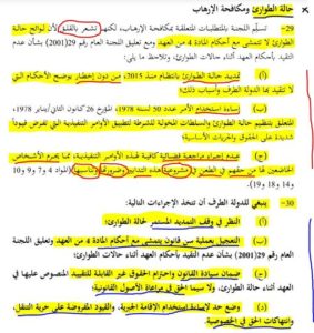 أ ــ تمديد حالة الطوارئ بانتظام منذ 2015، من دون إخطار (إشعار الأمين العام للأمم المُتَّحدة الَّذي يُشعرُ اللَّجنة الأُمميَّة والدُّول الأطراف في العَهْد)، يوضِّح الأحكام التي لا تتقيَّد بها الدَّولة الطَّرف، وأسباب ذلك،
