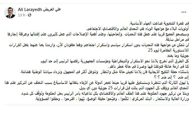 وحذّر علي العريّض، في تدوينة نشرها على صفحته الرسمية بموقع التواصل الإجتماعي “فيسبوك”، من”هول الكارثة التي ستستفيق عليها البلاد قريبا حين تعجز الدولة عن الإيفاء بنفقاتها الأساسية بسبب التخلف عن التركيز على هذا التحدي المالي ووقف كل الجهود التي بُذلت قبل قرارات 25 جويلية دون أي بديل”، وفق قوله.
