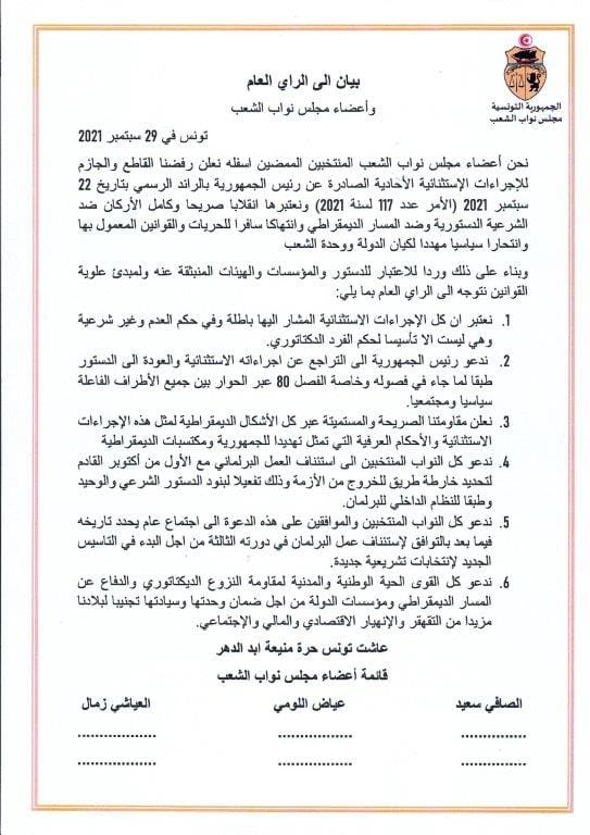 وإعتبر هؤلاء النواب، في بيان صادر عنهم، (تلقّت الرأي الجديد نسخة منه)، اليوم الإربعاء 29 سبتمبر، أن هذه الإجراءات “باطلة”، وفي حكم العدم وغير شرعية، وهي تؤسس إلى حكم فردي دكتاتوري.