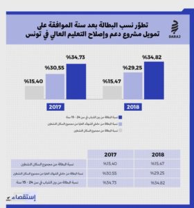 ترتفعٌ في تونس نسب البطالة بشكل كبير لتصل إلى 15.5 في المئة من مجموع السكان النشطين عام 2016. وتعتبر فئة الشباب في سن 15-24 سنة أكبر شريحة تعاني من البطالة، بـ 34.8 في المئة من مجموع السكان النشطين، أما أصحاب الشهادات العليا فقد بلغت نسبتهم في السنة ذاتها، أي سنة الحصول على موافقة القرض 31.45 في المئة.