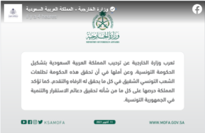 أعربت وزارة الخارجية السعودية اليوم، في صفحتها الخاصة (فيسبوك)، عن ترحيب المملكة بتشكيل الحكومة التونسية الجديدة، معبرة عن أملها في أن تحقق تطلعات الشعب التونسي.