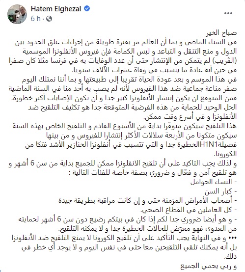 وأضاف حاتم الغزال، في تدوينة نشرها على صفحته بموقع التواصل الإجتماعي “فيسبوك”، أن “فيروس الأنفلونزا الموسمية لم يتمكّن في الشتاء الماضي من الإنتشار، بما أن العالم مرّ بفترة طويلة من إجراءات غلق الحدود بين الدول و منع التنقل و التباعد ولبس الكمامة ولم يتمّ تسجيل عدد كبير من الوفيات الناجمة عنه”.