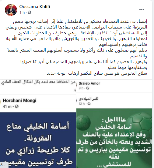 وأضاف أسامة الخليفي، في تدوينة على حسابه بموقع التواصل الاجتماعي “فيسبوك”، قائلا: ”اتصل بي عديد الأصدقاء مشكورين حول إشاعة يروجها بعض المرتزقة على منصات التواصل الاجتماعي مفادها الاعتداء على شخصي ونقلي إلى المستشفى”، مضيفا: ”أردت تكذيب الإشاعة وهي خطوة من الخطوات الاخرى لمحاولة الترهيب والتخويف والإرباك”.