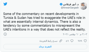 وكتب قرقاش عبر حسابه على موقع “تويتر”، أن “بعض التعليقات على التطورات الأخيرة في تونس والسودان، حاولت المبالغة في دور الإمارات في ديناميات داخلية بشكل أساسي، كما أن ثمة ميل من جانب بعض المعلقين، إلى تحريف نوايا الإمارات بطريقة لا تعكس الواقع”، بحسب قوله.