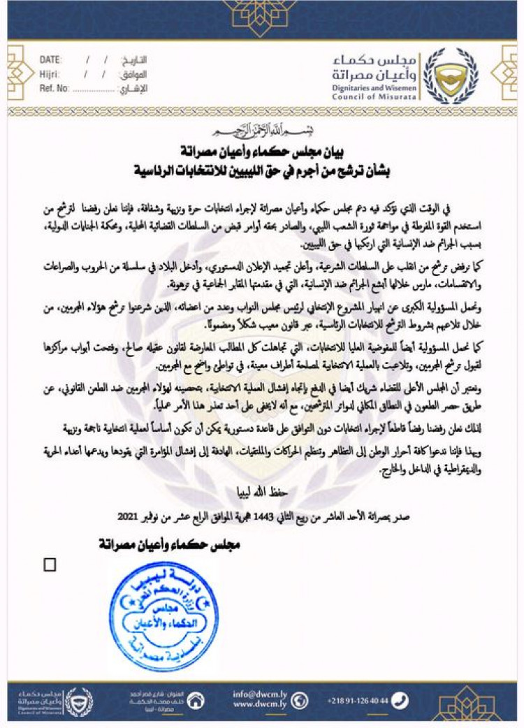 رفض مجلس حكماء وأعيان مصراتة، ترشّح سيف الإسلام القذافي للإنتخابات الرئاسية.