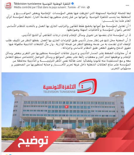 وأكّدت التلفزة الوطنية، في بلاغ توضيحي، أن تعامل المؤسسة مع أعوانها يخضع فقط للقانون والتراتيب الجاري بها العمل و بالتحديد للنظام الأساسي الخاص بأعوان المؤسسة و لأخلاقيات المهنة وضوابطها، وأن المؤسسة تنأى بنفسها عن تحويل وسائل الإعلام لإحدى درجات التقاضي أو التتبع التأديبي.