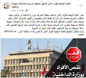 حذرت النقابة الوطنية لقوات الأمن الداخلي، سلطة الإشراف بوزارة الداخلية، مما أسمته بــ “تواصل إنهاك الطاقات البشرية، وخاصة أبناء الإدارة العامة للأمن العمومي، والنقص الفادح في الأفراد على مستوى تعداد الأقاليم والمناطق”، الذي ولّد حالة احتقان لدى الأمنيين جراء كثرة الخدمات اليومية.