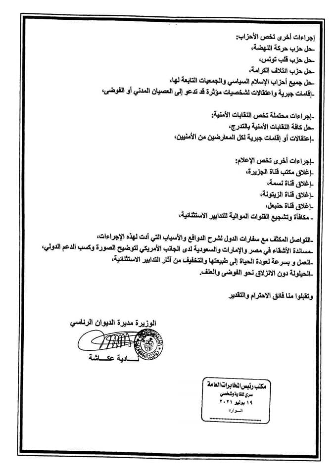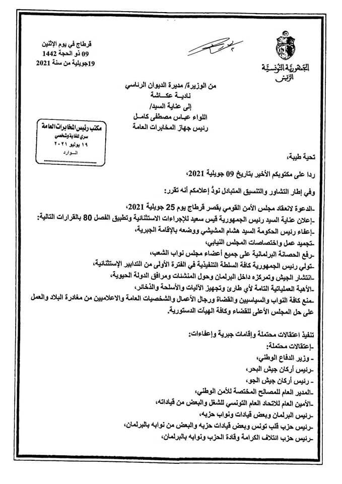 نشر موقع “ويكيليكس عربي”، وثائق “خطيرة”، تتعلّق بالمراسلة الموجّهة من مديرة الديوان الرئاسي، نادية عكاشة، إلى الإدارة العامة للمخابرات الحربية المصرية، بخصوص خارطة طريق لما كان يعدّ ليوم 25 جويلية 2021، بتونس.