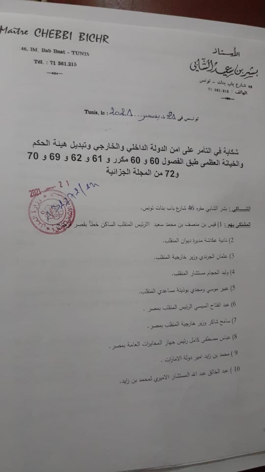 قام المحامي، بشر الشابي، برفع شكاية ضدّ 10 شخصيات وطنية، ورؤساء دول، من بينهم رئيس الجمهورية، قيس سعيّد، ورئيس مصر، عبد الفتاح السيسي.
