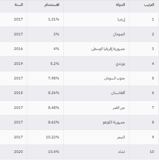 وفيما يلي الدول العشر الأدنى من حيث استخدام الإنترنت، مرتبة حسب النسبة المائوية لسكانها الذين يستخدمون الإنترنت، وفقاً لموقع “US News”.
