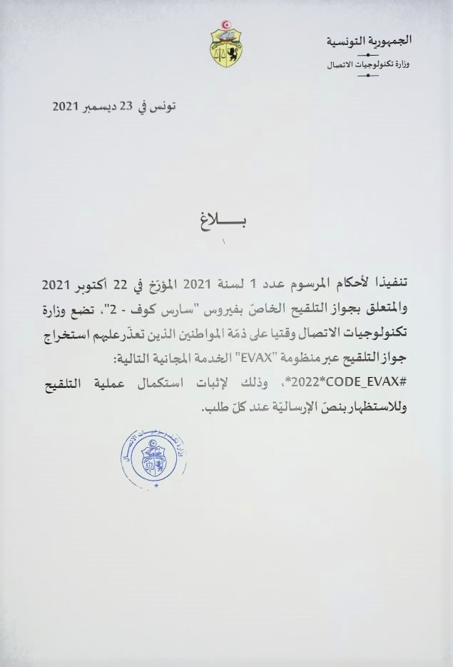 أعلنت وزارة تكنولوجيات الإتصال، عن توفير خدمة مجانية وقتية لكل المواطنين اللذين تعذّر عليهم إستخراج جواز التلقيح عبر منظومة “EVAX” وذلك عبر إدخال الرمز، *2022*CODE_EVAX# وذلك لإثبات استكمال عملية التلقيح وللاستظهار بنصّ الإرساليّة عند كلّ طلب، حسب بلاغ صادر عن الوزارة.