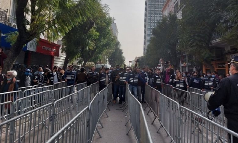 وكانت قوات الأمن، شرعت منذ الصباح الباكر، في وضع إجراءات غير مسبوقة في تاريخ البلاد، لمحاصرة المتظاهرين، ومنعهم من الوصول إلى شارع الثورة، كما يطلق عليه في الأوساط الاجتماعية والسياسية، عبر حواجز حديدية، مكثفة وبطريقة المربعات المتتالية، والمنظمة بشكل متشابك، مع تخصيص أعداد من الأمنيين في شكل “حواجز بشرية” محايثة لتلك الحواجز الحديدية، وهي أول تخطيط أمني من نوعه، الذي شرعت الداخلية، في تطبيقه منذ مسيرة باردو السابقة، التي نظمتها حملة “مواطنون ضدّ الانقلاب” أمام مجلس نواب الشعب قبل بضعة أسابيع.