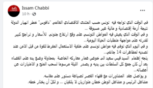 وقال الشابي، أنّ الرئيس يتجه لخوض معاركه للهيمنة على القضاء، في وقت يعلن المنتدى الاقتصادي العالمي “دافوس”، عن “خطر انهيار الدولة التونسية نتيجة أزمة اقتصادية ومالية غير مسبوقة”..