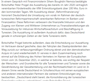 قال السفير الألماني في تونس “بيتر بروغل”، أن قرار دفع قرض بقيمة 100 مليون يورو من بنك التنمية الألماني ( KfW ) في الأيام المقبلة لفائدة تونس، “تم الاتفاق عليه تعاقديًا في 2020”..