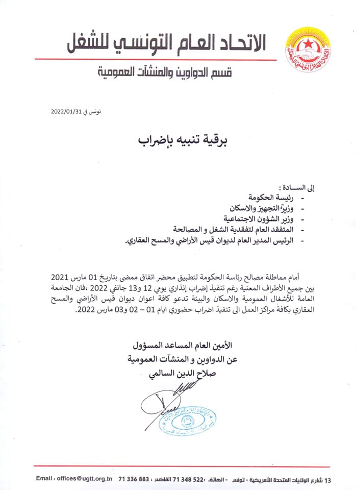 دعت الجامعة العامة للأشغال العمومية والإسكان والبيئة، أعوان ديوان قيس الأراضي والمسح العقاري، إلى تنفيذ إضراب عن العمل، أيام 1 و2 و3 مارس المقبل.