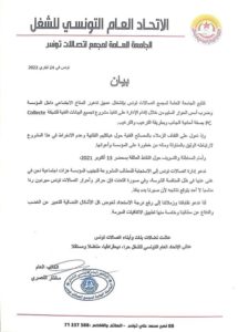 وناشدت الجامعة النقابية، الموظفين والعاملين في مؤسسة “اتصالات تونس”، عدم الانخراط في هذا المشروع لارتباطه الوثيق بالمناولة، بالنظر إلى خطورته على المؤسسة وأعوانها.